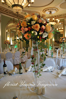 Великолепное убранство зала украсили роскошные высокие вазы на столах. Пожелание невесты - сделать оформление мягким, и в тоже время с осенними нотками...